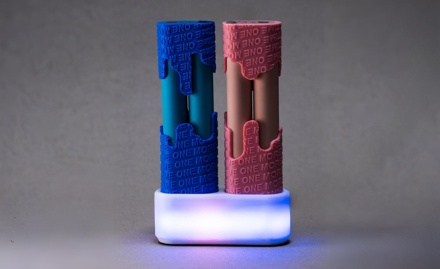 Each One More Night is crafted from bio-plastic, aluminum, and lithium-ion cells recovered and tested from disposable vapes
